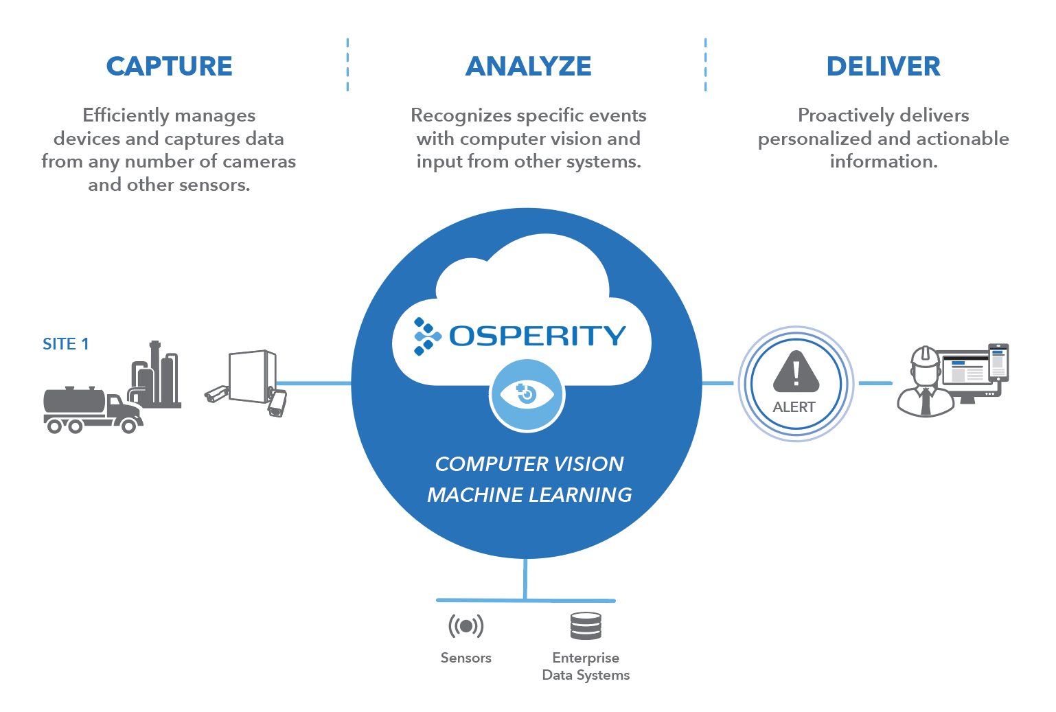 Osperity’s industrial computer vision (CV) is a type of artificial intelligence where computers are trained to recognize objects and activity at industrial sites from images. By replacing human observation with Osperity’s CV solutions, customers quickly gain an accurate understanding of events or activities of interest, for faster and better decision-making. Osperity is designed to integrate, train and optimize CV algorithms for industrial applications.
